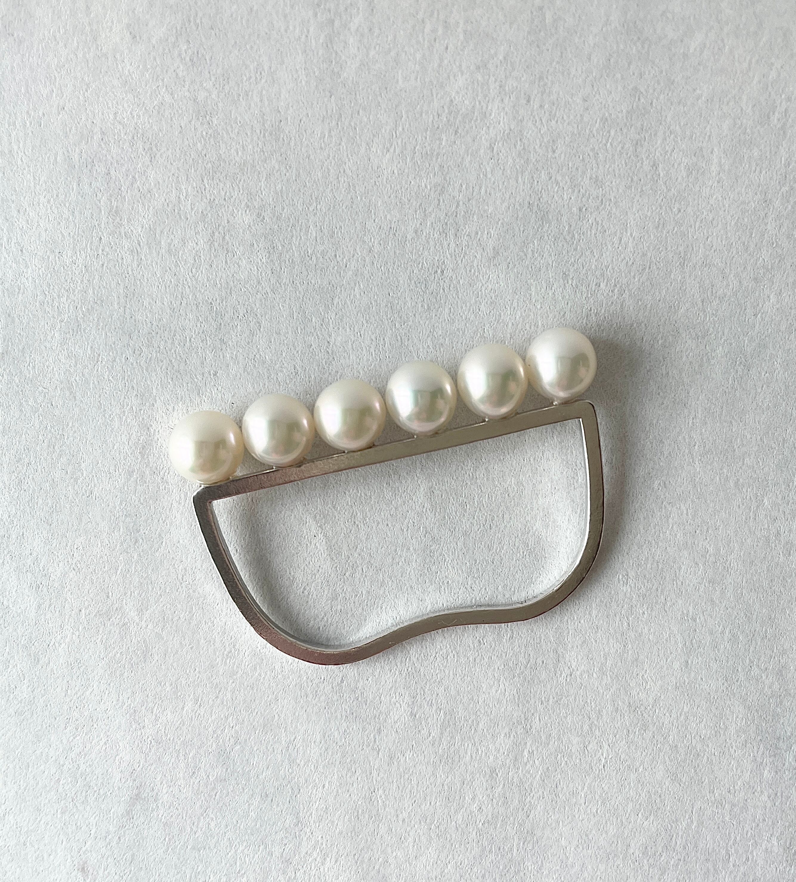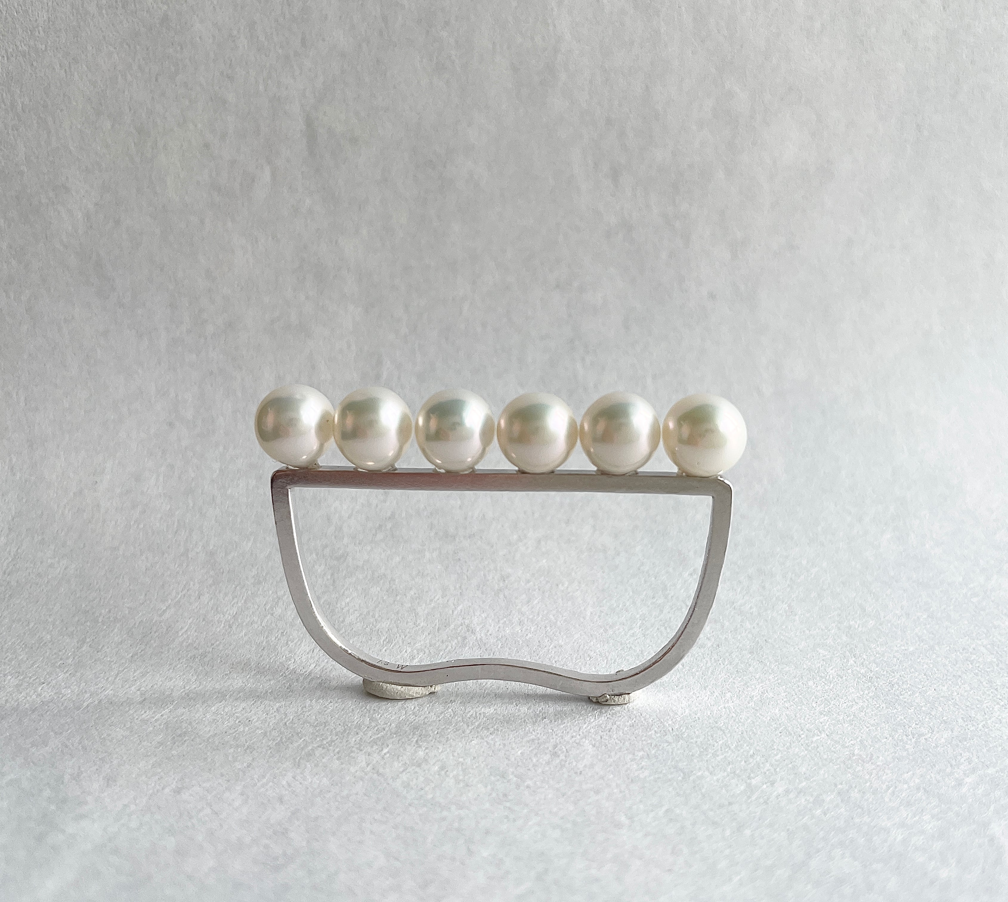 照りの良い大粒のパールを使用した、2本指のリングです。
