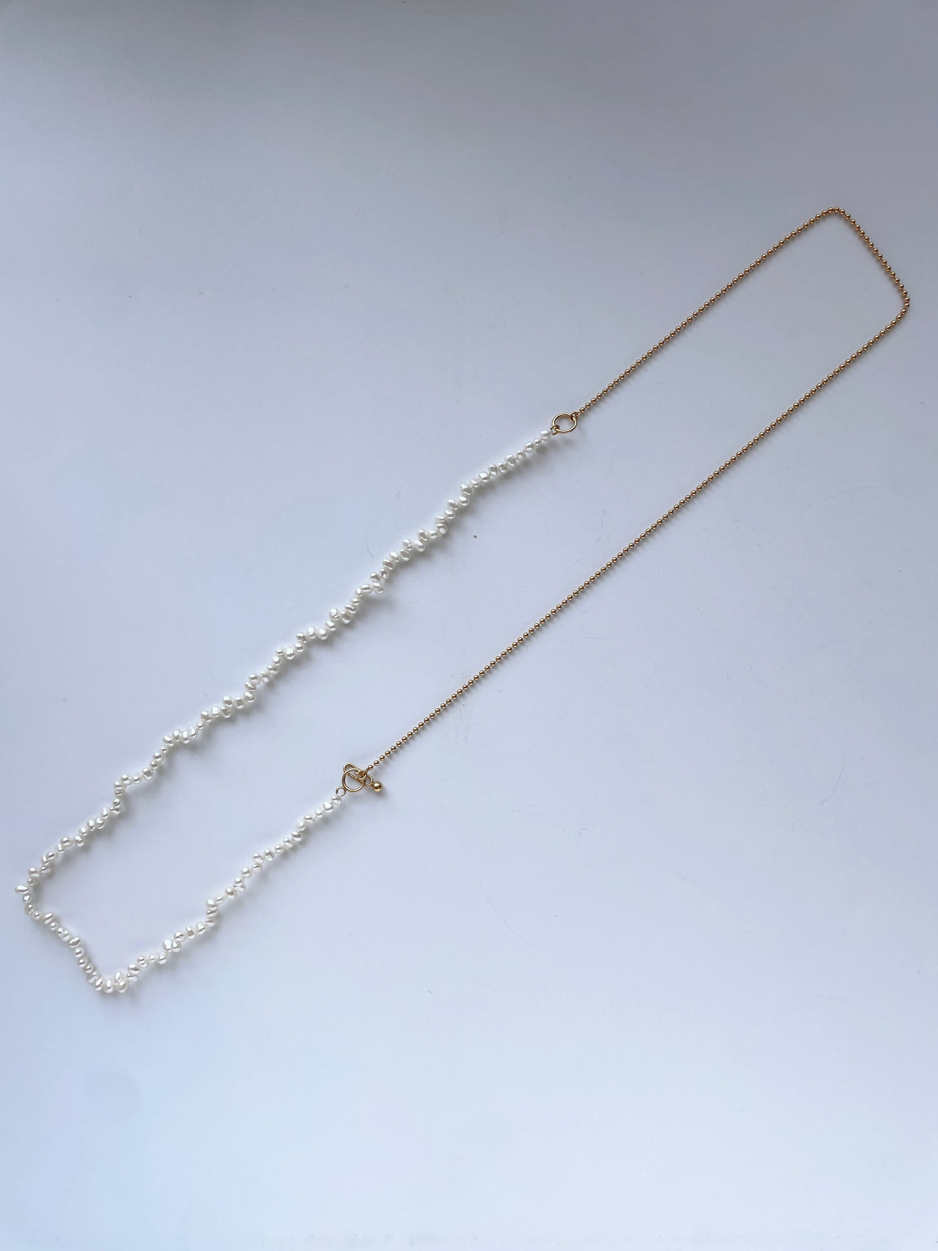 チェーンとパールがハーフとなっているネックレス。